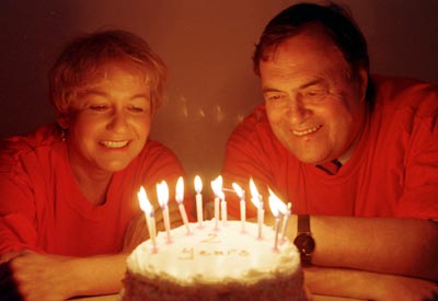 MPs John Prescott and Rosie Winterton celebrate the Labour Government's second anniversary with a birthday cake
