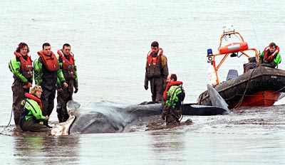 Rescuers battle to save the life of a thirty foot Minke whale washed up on the banks of the River Humber