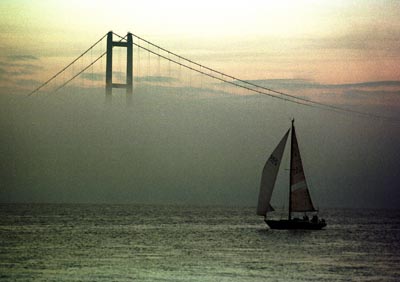 A yacht passes under the Humber Bridge in unusual weather conditions